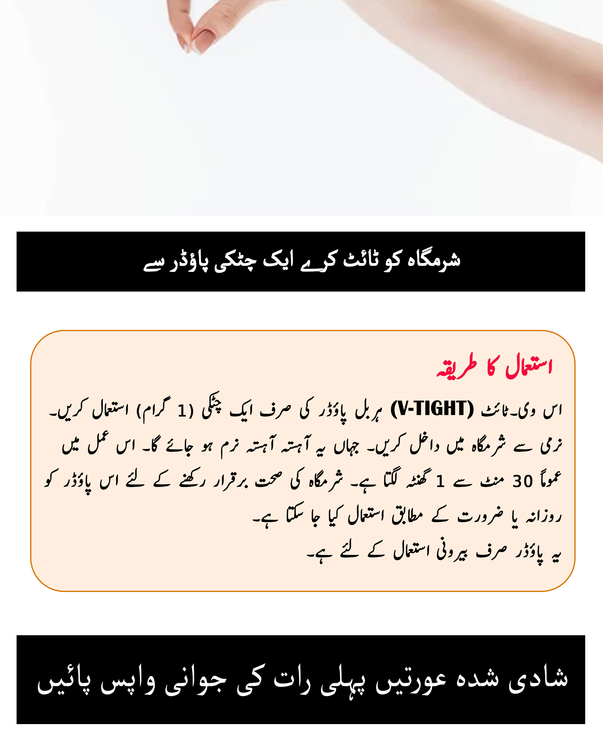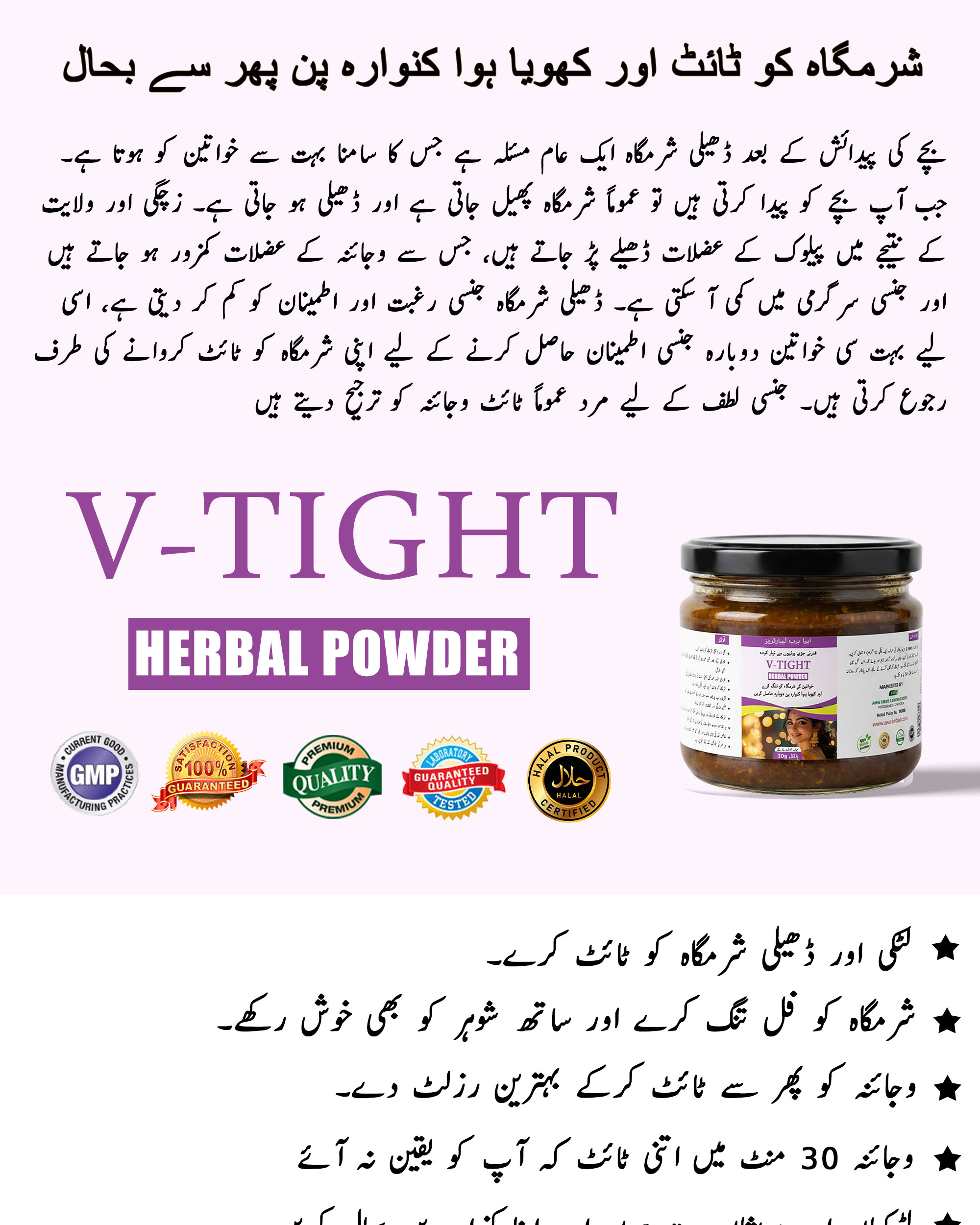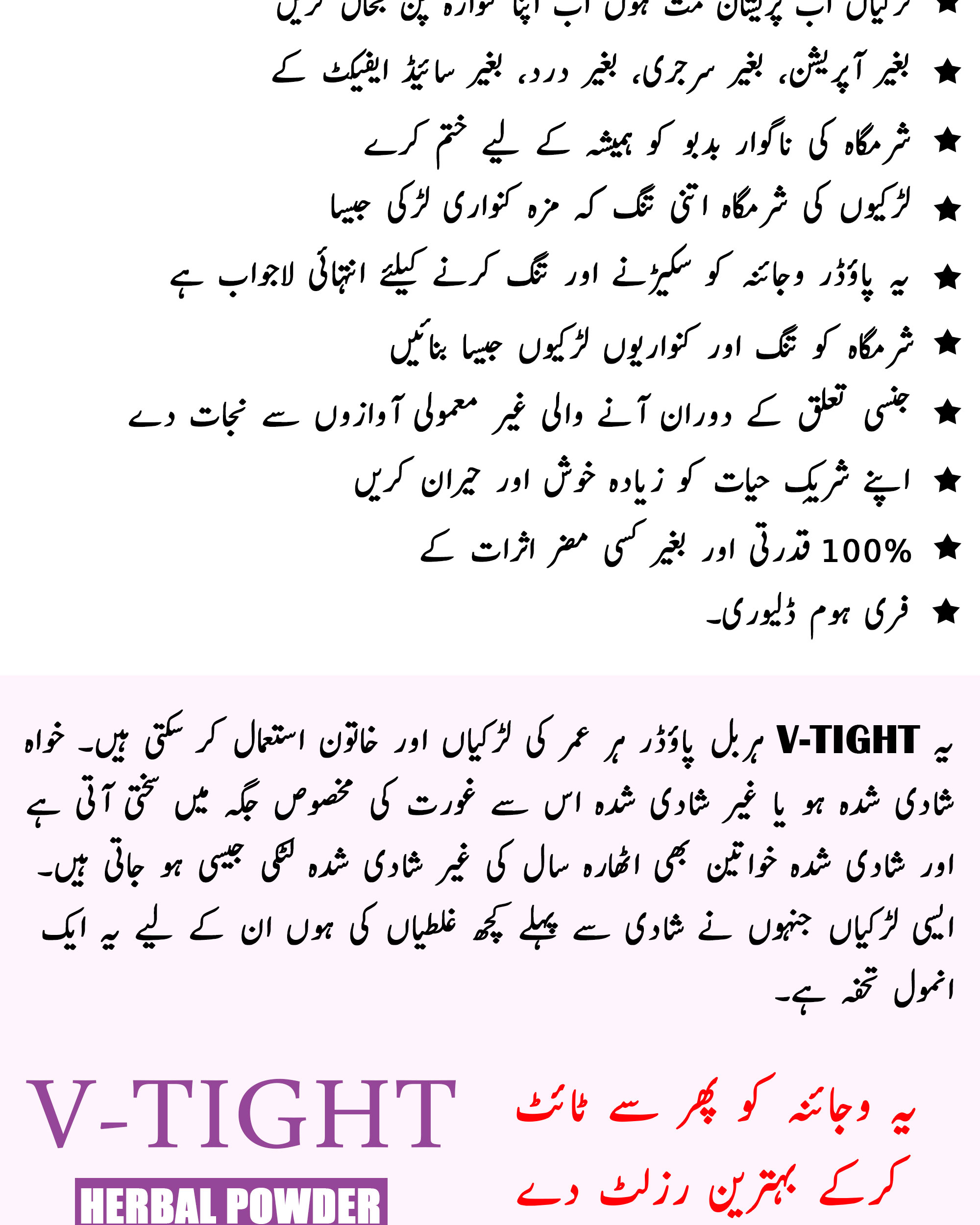 V-Tight herbal powder can reduce the effects of increasing age and looseness. Married or unmarried women can use it. Due to this, the weakness of women is removed, and tightness comes in the body. Many women, after one year of marriage, face this problem. Often elders advise girls to use it before marriage as well. By using it, within a few days, the vagina becomes tight.