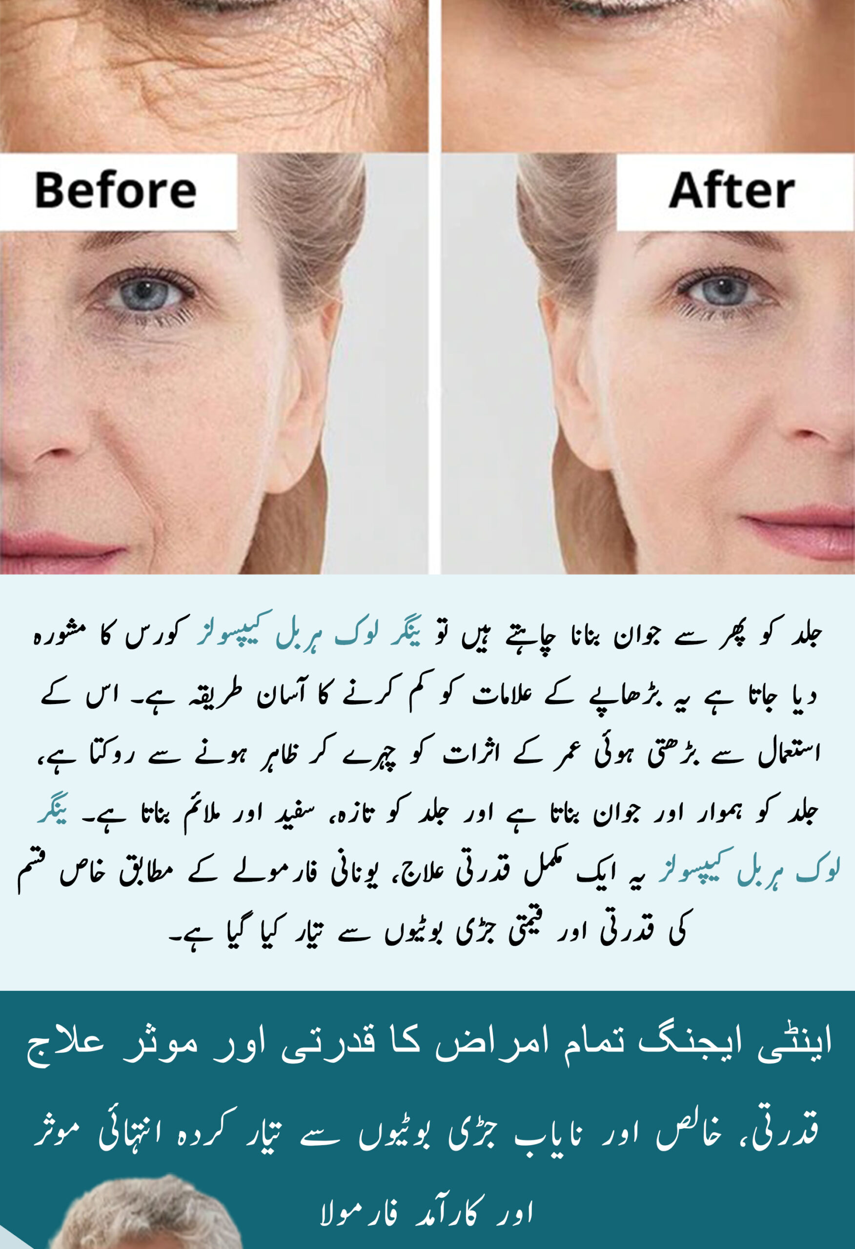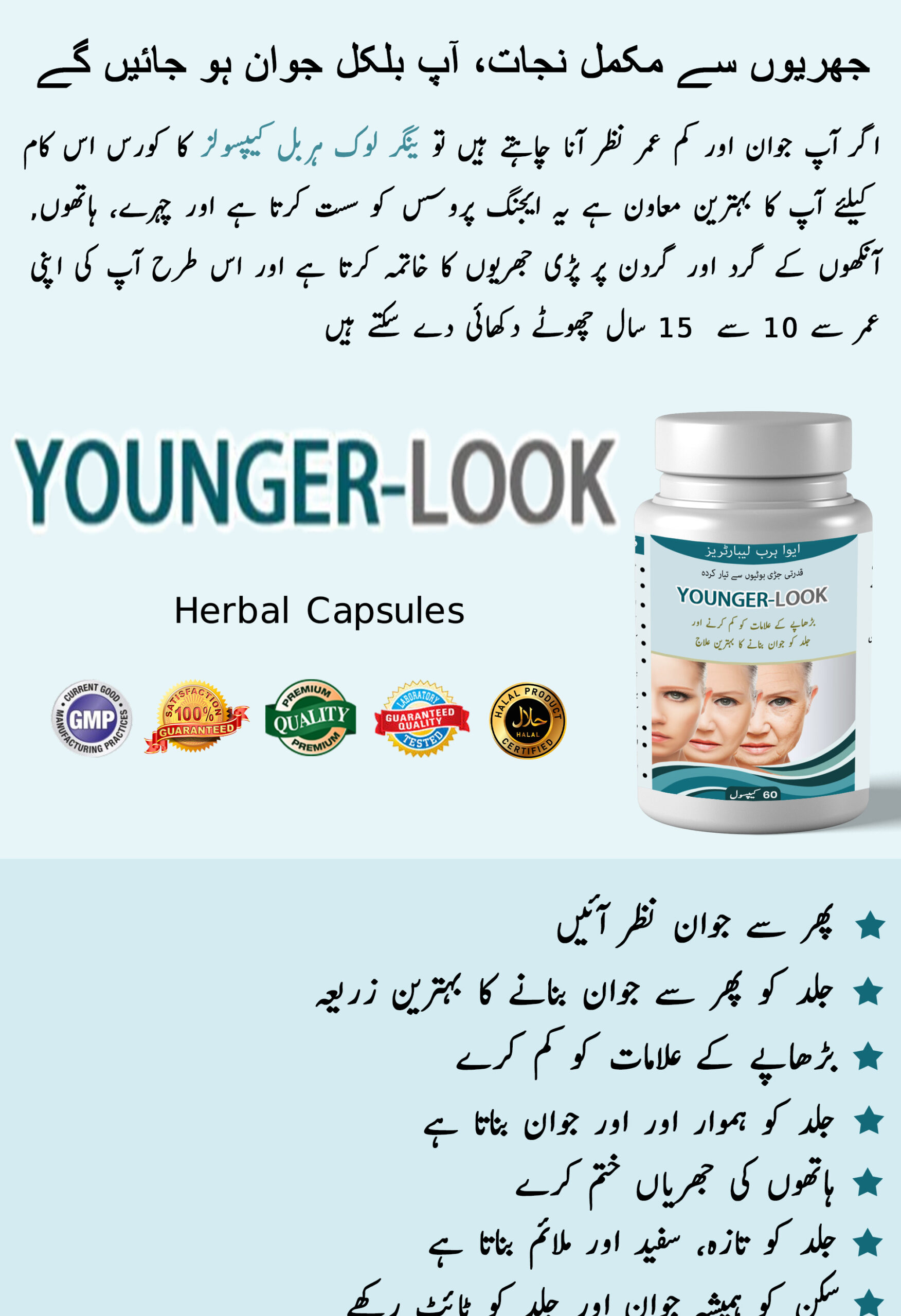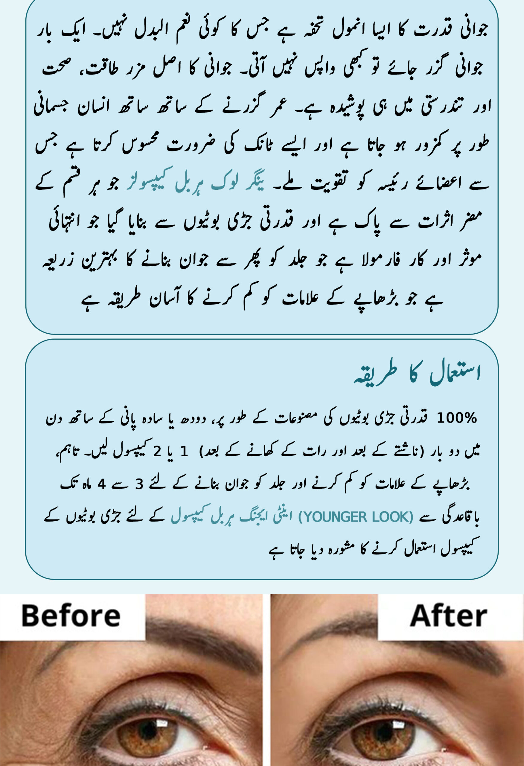 As Younger-Look herbal capsule is an herbal product, you cannot expect an overnight result. It is recommended to take this herbal product for younger look consistently for 3 to 4 months to get satisfactory result.